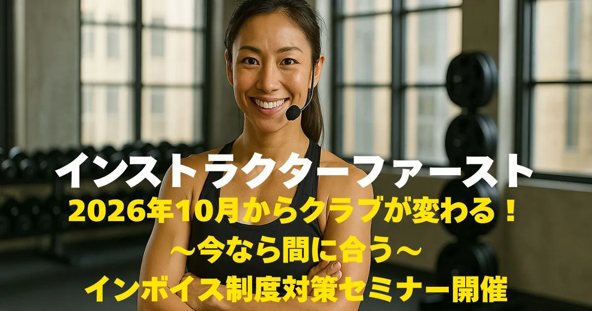 新着ブログ 2026年10月からの変化に備える!インボイス制… 2026年10月から変わる! インボイス… Continue Reading 2025年11月3日 ご案内 年内を目安に請負先からの連絡が始まります インボイス制度第二ステージが始まります … Continue Reading 2025年10月12日 ふと思う事 ペットボトル200円時代突入 ペットボトル飲料は、いくら? 2年前まで… Continue Reading 2025年10月7日 ふと思う事 話題のワークライフバランスという言葉 今、話題になっている『ワークライフバラン… Continue Reading 2025年10月6日2025年10月6日 ふと思う事 ブログ一覧へ お勧め商品のご案内 運動指導者の為のかんたんマーケティング2 ¥3,300 購入する 運動指導者の為のかんたんマーケティング1 ¥3,300 購入する 『好き』と『得意』をビジネスに ¥2,200 購入する 動けば変わる 動けばわかる ¥2,200 購入する
